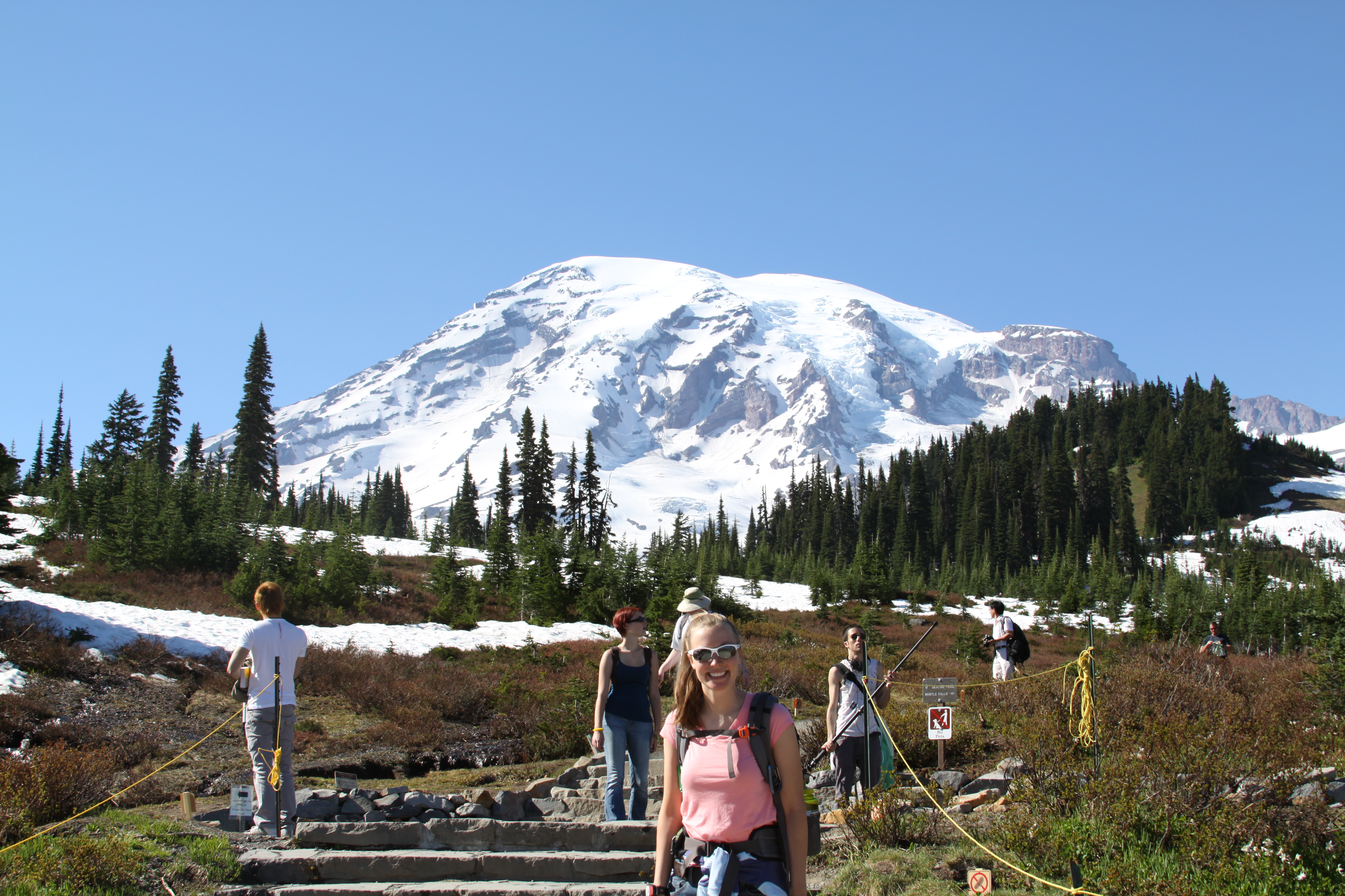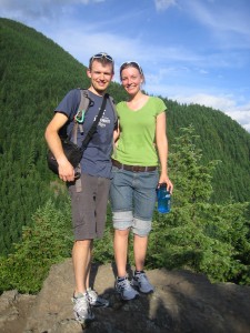 We packed up from our seaside stay and headed to the Hoh rainforest. Washington state has one of the few temperate rainforests in the northern hemisphere, and also one of the largest in the world. The rainforest is impressive. We stopped at a ranger station to pick up my by now mandatory park patch, and while we were there asked the ranger if she had any recommendations for what to see if we only had a day on this side of the park. The ranger, who was an older woman looked like a cross of Mrs. Claus and Willie Nelson, sighed and said “Honey, let me tell you a story. One of my colleagues had a lady come in and ask what she should do if she just had an hour in our park. He told her to just sit down and cry.” She then whipped out a map and began circling and marking things, ultimately coming up with a list of things to do, ordered by priority and amount of time they would take. The last thing she circled was Hurricane Ridge, where we planned on going tomorrow. As she circled it, she said, “Huh, better check on that. It might actually be sunny there.” Saying that, she grabbed the phone, dialed a number, and then balled into the phone “Of course its me you old bat! Who else would be calling! So is it sunny up there in that old station of yours? I’ve got a young couple who want to see some pretty mountains.” After a few more moments of banter, she put the phone down and said “Yup, its been clearing off up there in the afternoon, so you outta have a great view.”