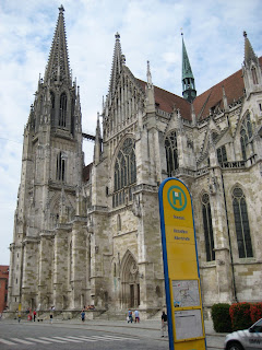 Seeing there was nothing else to do, we put our tourist ways aside and headed out into the city to do what we do best: wander. Making our way down the main street from the train station our first stop became apparent. Rising above the city were the two largest church spires we had ever seen, done in a fantastic gothic style. This turned out to be the 12th century St. Peter’s Cathedral. This was by far the most interesting church we had visited. It was magnificent but not overdone. Gothic carvings and gargoyles covered the exterior, and the entire church was built in white, stained stones that exuded a sense of age. (Some of this was a show, however; the towers had been added by none other than King Ludwig II in the 19th century). The inside was equally impressive, with stain glass windows that rose for what must have been 60 feet, and the highest vaulted ceiling we had yet seen. The dim interior added to the ancient feel of the place, and not even the construction work being done on the organ could take away from it. Around the interior edge of the building there were the tombs of saints and priests that had served there, set into the floor. Each was covered with a large stone plate that you could walk on (if you so chose), with life-sized images of the deceased carved into them, and grave markers on the wall above. We felt like Indiana Jones, especially while writing notes in the moleskin journal from Deborah. And no matter what we did, we couldn’t quite shake the sense that if we were to step on one of the tombs, spikes would shoot out of the wall, or a large boulder would come rumbling down the center aisle of the church.